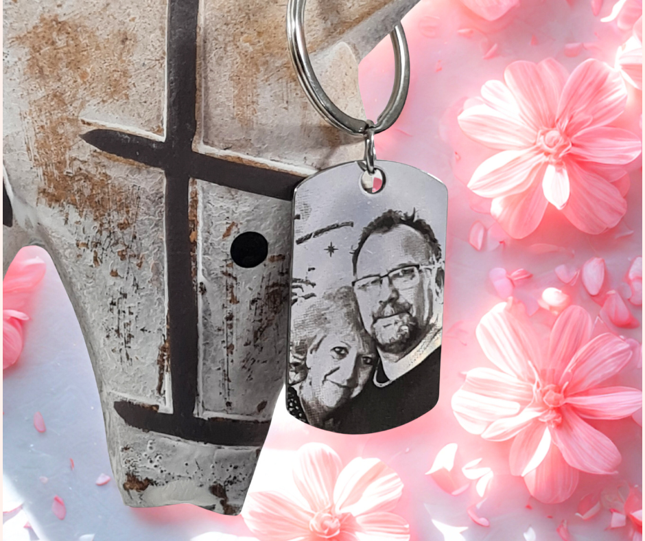 Personnalisez votre porte-clés en acier lustré avec une photo gravée au laser pour un accessoire unique et chargé d’émotions.